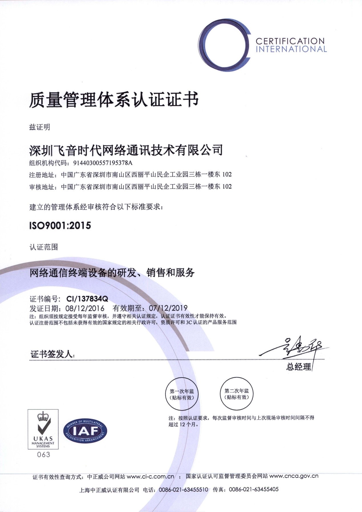ITB8888通博时代于2016年12月8日成功通过并获得ISO9001质量管理体系认证证书。