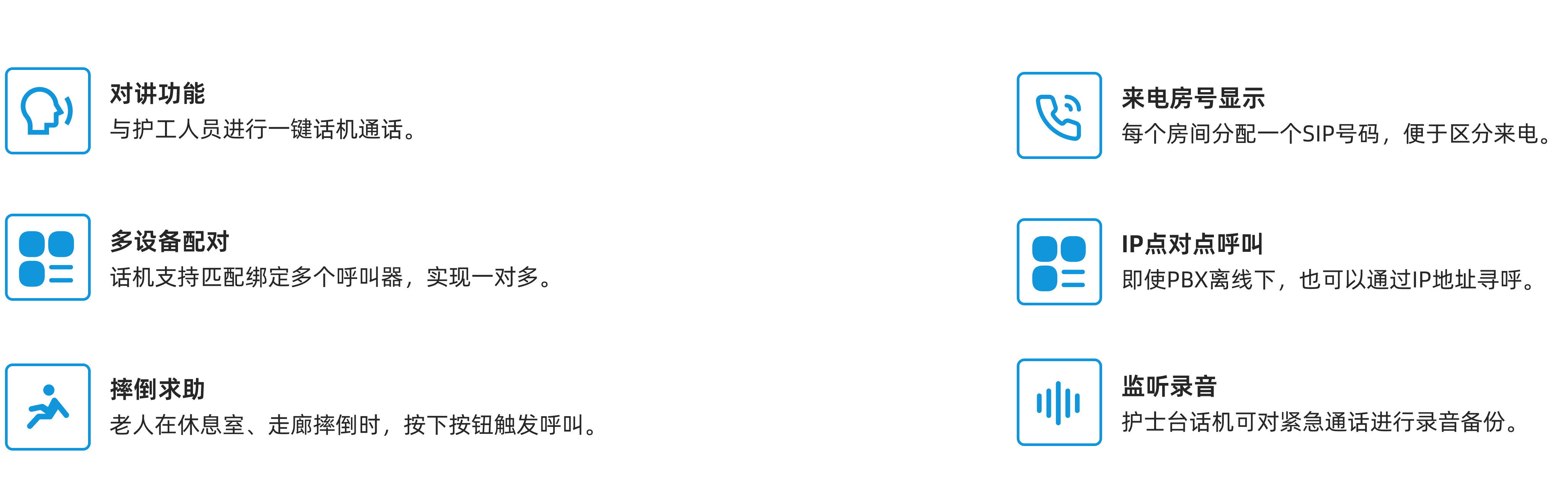 在养老院场所下,经常会出现老人行动不便,无法走到话机面前按下拨打服务号码,以至于护工人员没有办法第一时间到达房间,对此ITB8888通博推出了HB01呼叫器,通过与ITB8888通博P21话机绑定,实现紧急情况一键呼叫护工人员,提高响应能力、用户满意度和护工人员的工作效率。
