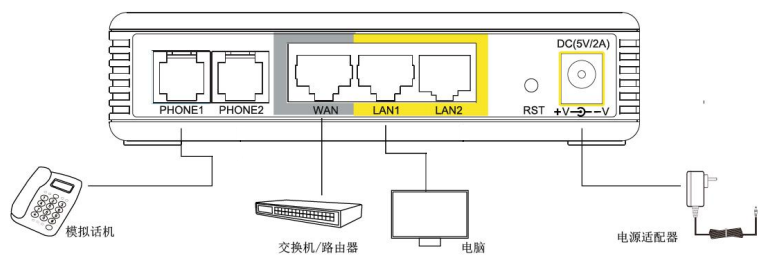 1、准备两根网线和一根电话线,适配器的WAN口通过网线1接入Internet网络;LAN1口通过网线2接入电脑,作为调试适配器使用;phones1口通过电话线接到模拟话机,摘机能听到提示语表示接入成功。