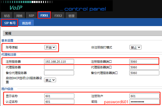 选择“FXS1”--“SIP账号”,开启账号使能,输入分机号码和密码,端口,服务器地址等信息,点击保存并应用。