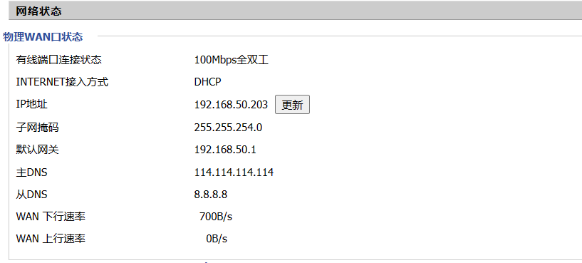 首先点击“状态-系统信息-物理WAN口状态”,查看当前所获取的IP地址。