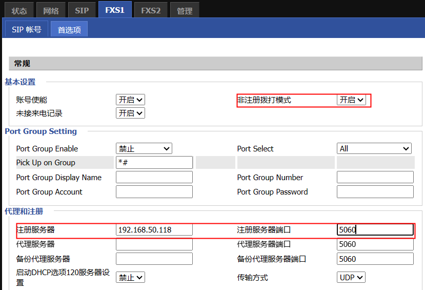 1、FXS1配置注册信息到“FXS1-SIP”填写FXS口的注册信息。开启非注册拨打模式,IP地址+端口,均为FIP1X的IP地址和端口