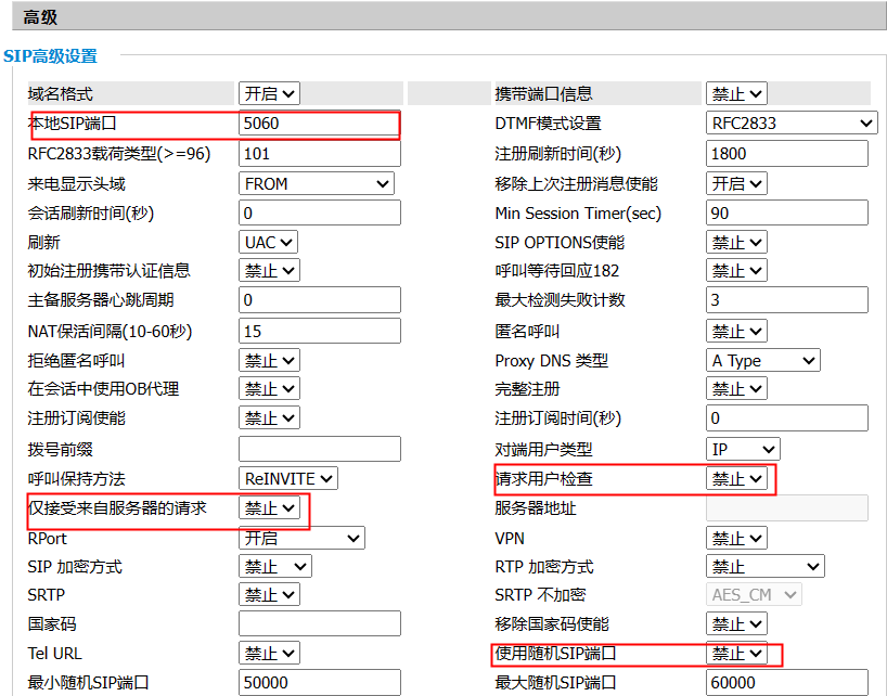 在SIP高级设置中,FXS1的本地SIP端口设为5060,禁止请求用户检查,禁止仅接受来自服务器的请求,禁止 使用随机SIP端口,开启允许IP呼叫