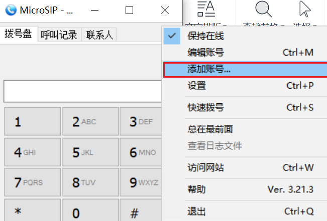 1.1 打开MicroSIP,点击右上角的图标,选择添加账号;
