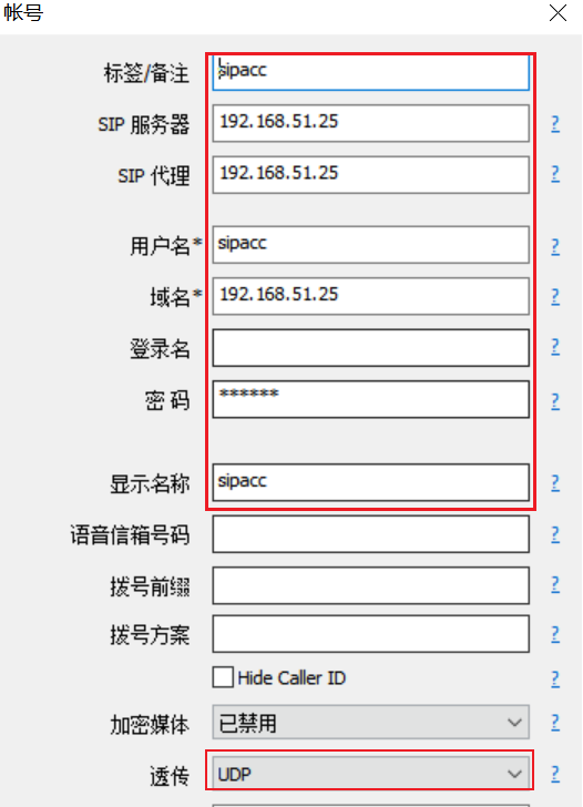 2.1 如下图所示填写账号、用户名、密码、服务器等信息,透传选择UDP,再点击确定保存即可;