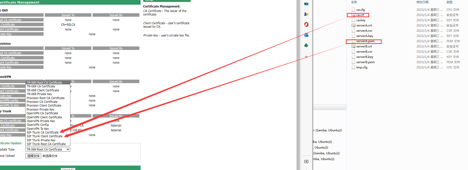 3.1 TLS注册需要先在FTA5111上上传两个证书,如下图所示:(两个证书附在下面)