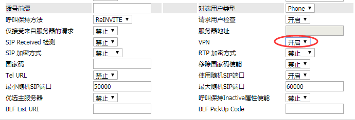 2. 然后在SIP高级中”VPN”选项选择”Enable”,则实现通过虚拟IP地址注册