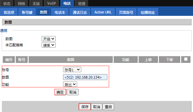 2. 在“电话”---“数图”中开启数图功能并设置匹配策略为接受,点击“添加”
