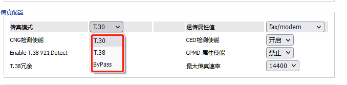 传真模式支持三种:T.30、T.38、ByPass(透传)
