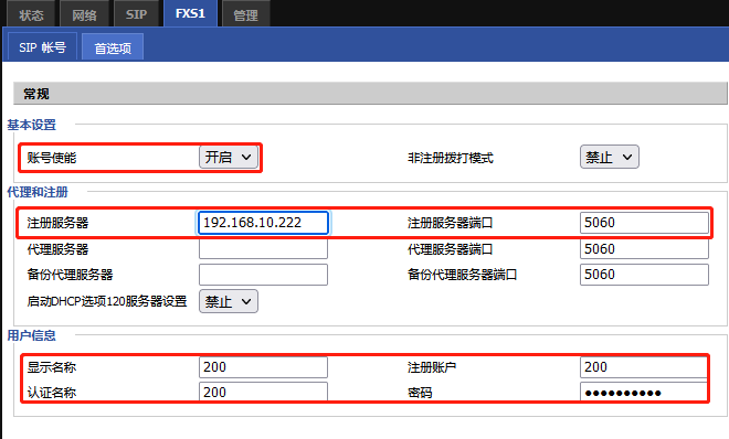 说明:上图中的200号码是由电话服务器分配的,请联系电话服务器提供号码和密码注册信息。