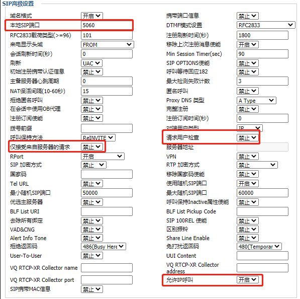 2、在“VoIP”---“账号”---“SIP高级设置”,设置四个选项为如下图所示。