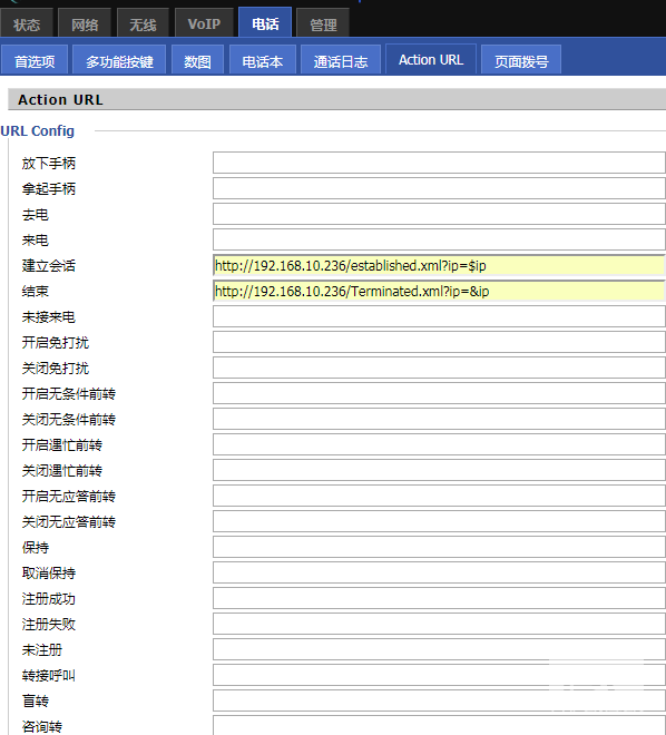 1. 通话消息上传实现方法进入“电话->Action URL”进行设置。在该页面中选择需要话机上报的动作,填写自定义URL,允许控制列表中填服务器ip,如下图所示: