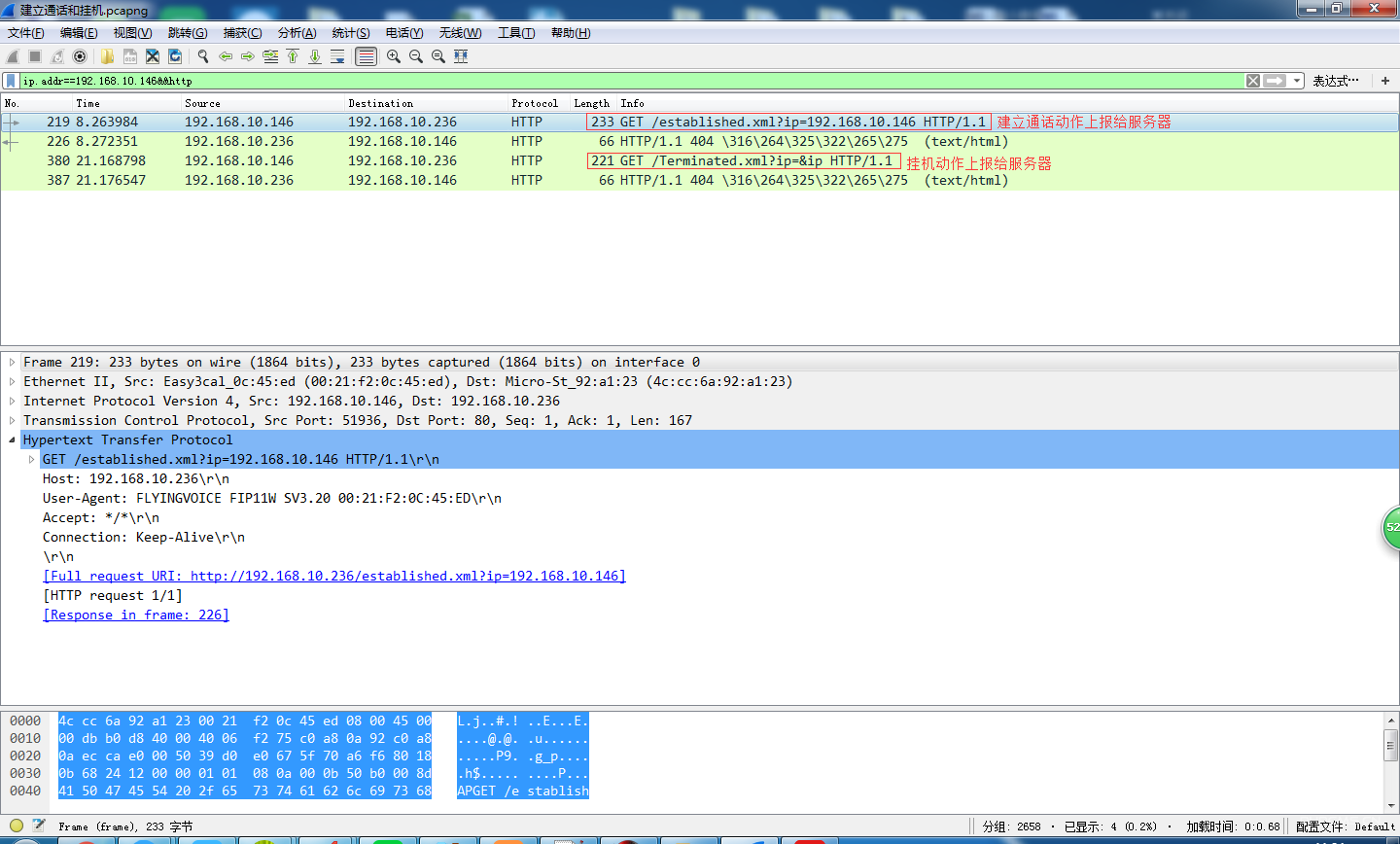 图中,http://192.168.10.236/established.xml?ip=$ip,192.168.10.236指的是http服务器地址,established指话机此时的状态为建立通话,ip=$ip表示本话机的IP地址。最终整条表示本话机建立通话时,服务器(192.168.10.236)收到ip地址为$IP的话机建立通话.报文如下:
