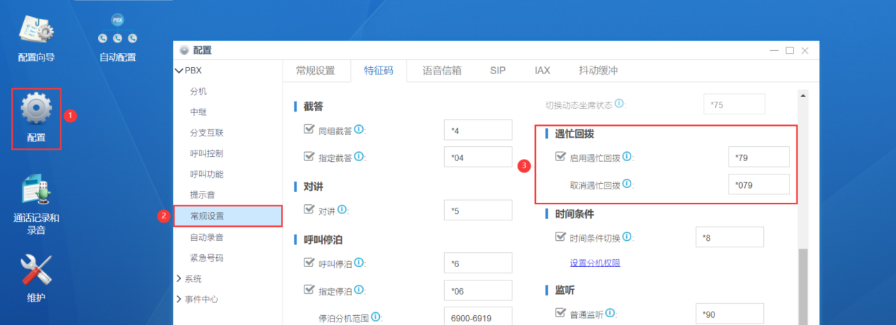 启用遇忙回拨】:一般默认为“*79”也可自定义(当被叫遇忙时,主叫挂上话筒,然后呼叫“*79+被叫分机号”即可启用遇忙回拨功能)