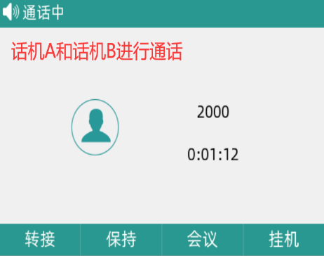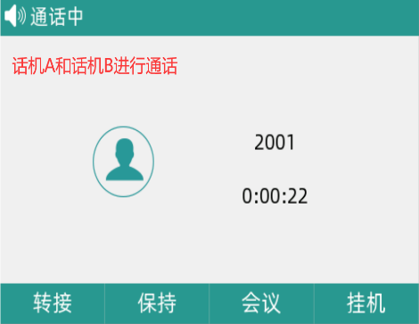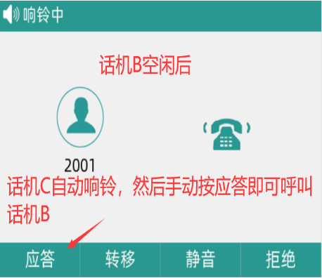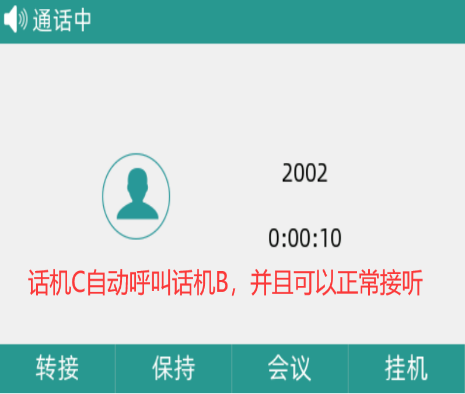 话机A和话机B进行通话,话机C拨打话机B遇忙,然后挂上话筒输入“遇忙回拨码”,当话机B处于空闲状态时,话机C可以自动呼叫话机B