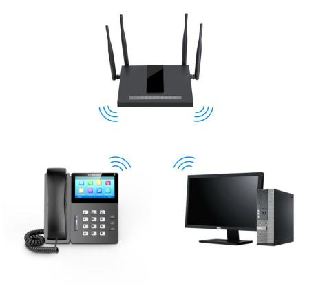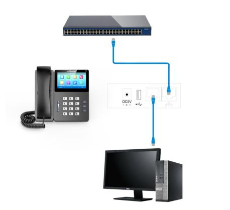 按照如下拓扑图连接话机和电脑,在话机屏幕上找到话机的IP地址,用这个IP地址登入话机的管理界面。