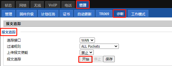 开启抓包功能后话机会自动进行网络抓包,进入“管理”--“诊断”--“报文追踪”,点击“开始”按钮。