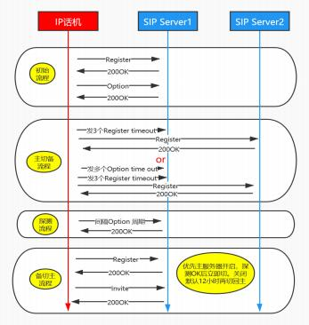 当主服务器异常时, 话机可快速切换至备用服务器,话机通过 option 消息检查到主服务器恢复后,话机重新 注册回主服务器,业务回归主服务器。若检测主服务器恢复后不希望话机立即切回主服务器,把“优选主服务