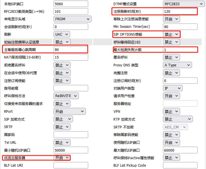 Prefer Primary SIP Server(优选主服务器) 默认关闭:当探测主服务器恢复后,备服务器切换回主服务器的时间为 12 小时;当配置开启后,立即由备服务器切回主服务器。