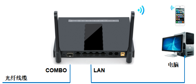 如果前端上网的宽带线是光纤,将光纤线路连接到路由器的光口(COMBO口),上网电脑连接到路由器的LAN口上。参考连接图如下: