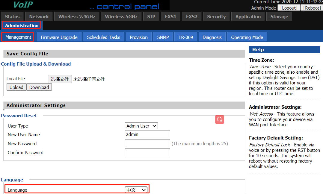 网页点击操作:Administration > Management > Language,选择“中文”,网页滑到底部点击“Save”。