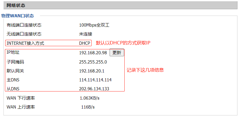 路由器WAN口默认是DHCP方式获取IP地址,为便于对路由器维护调试,建议改为静态IP地址。网页点击操作:“状态”--“系统信息”--“物理WAN口状态