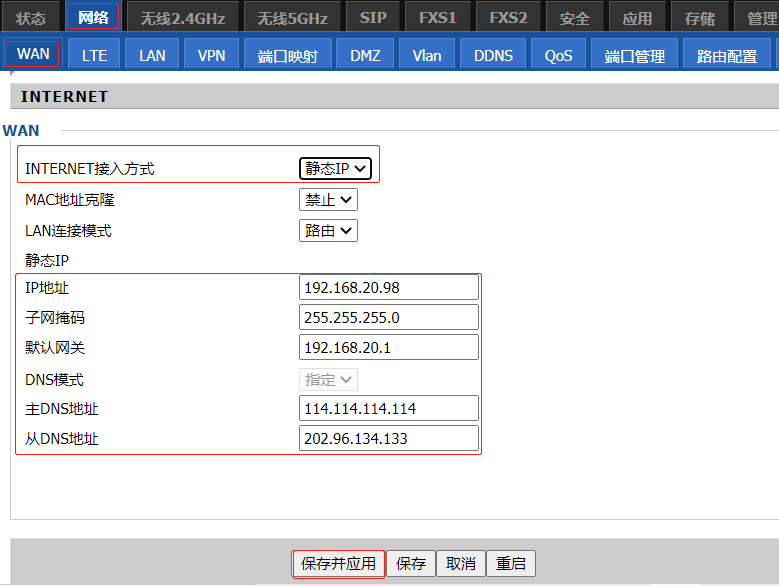 4、设置路由器WAN口静态地址并记录地址:192.168.20.98