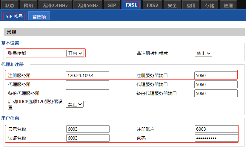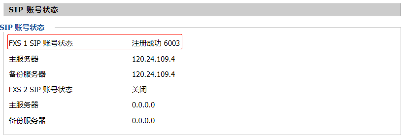 步骤三 注册FXS1口或FXS2口到SIP 服务器