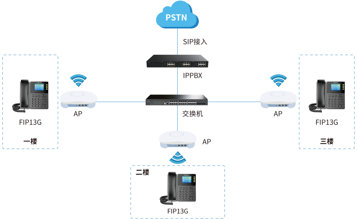 星纵S300主机部署在总部的核心交换机上,外部运营商线路采用SIP接入。为了保证网络接入的安全性,企业特别为语音系统划分了一个专用的语音网段,并对话机及主机的MAC地址进行了IP地址绑定。根据实际网络接入情况,IP话机可以通过有线或WiFi连接到网络。