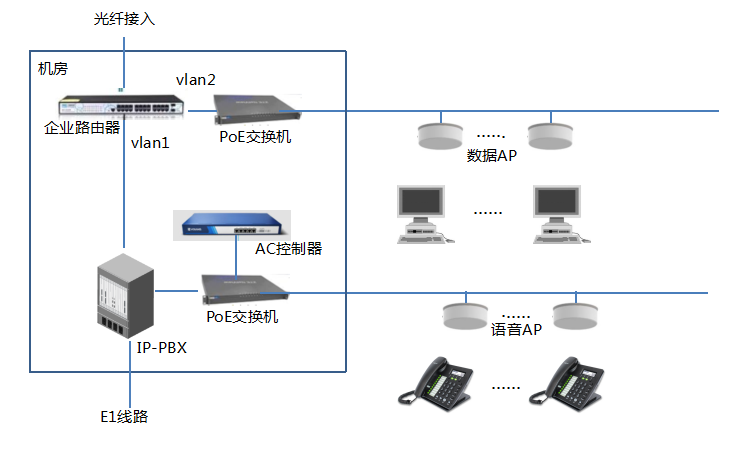 在办公楼中心机房部署IP PBX(TPX-800),系统上行可通过E1中继方式接入运营商通信网络。IP PBX下行通过IP接入无线热点,IP话机通过Wi-Fi接入无线热点(ITB8888通博时代吸顶APFWA12),以SIP协议方式注册到IP PBX,实现短号分机免费互拨以及统一出局。总部、分支及各门店之间可通过天润融通的平台进行统一通信,节省费用。