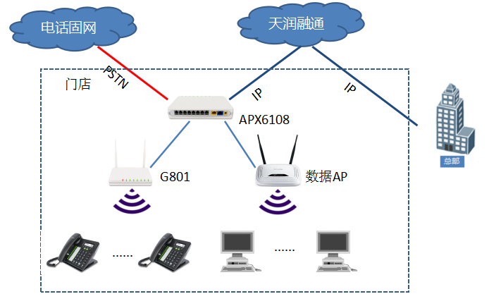 门店通过小型IP PBX(APX6108)支持8路电话线中继接入,使用无线AP(ITB8888通博时代G801)进行无线覆盖,实现无线话机的部署。门店IP PBX支持宽带接入、带宽管理和QoS,可保证通话的语音带宽及传输稳定。无线话机可分为两路注册天润融通的软交换,及门店的IP PBX。