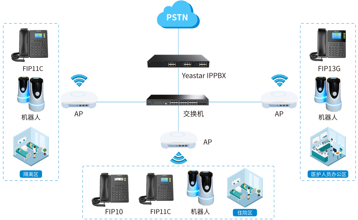 4、在网络互通的环境下,IPPBX通过自动部署的方式给话机下发分机号码信息,使住院区、隔离区、医护人员办公区等各个话机均能实现分机互通。