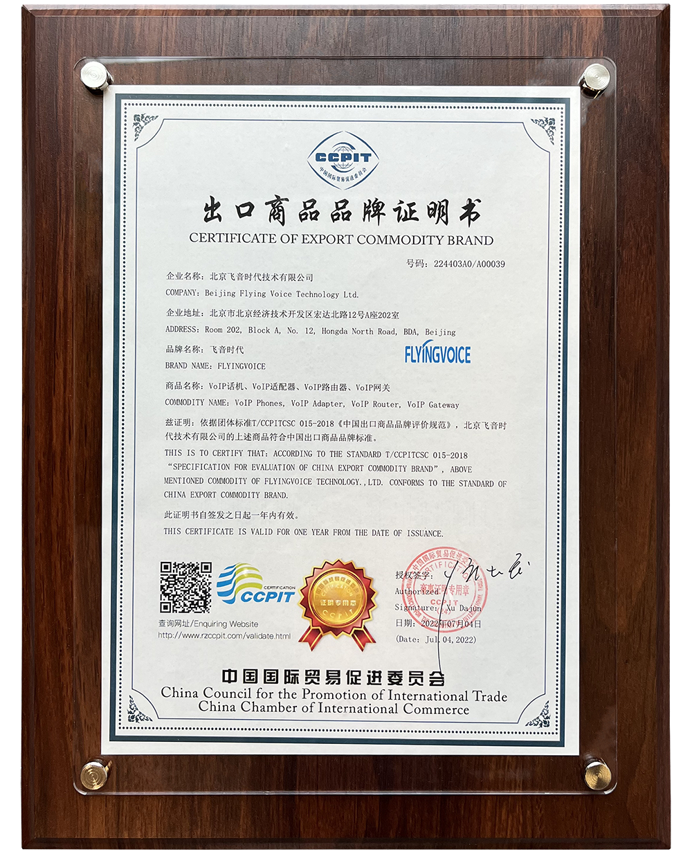 近日,ITB8888通博时代通过中国国际贸易促进委员会(简称:中国贸促会)评审,取得了由中国贸促会商事认证中心颁发的“中国出口商品品牌证明书”,涵盖了自主研发的VoIP话机、VoIP适配器、VoIP路由器等多款支持音视频处理能力的物联网(IOT)终端设备产品。这是国家权威部门对ITB8888通博时代能力的肯定,对ITB8888通博时代进一步拓宽海外市场、提高国际品牌知名度和国际市场竞争力带来了极大助力。