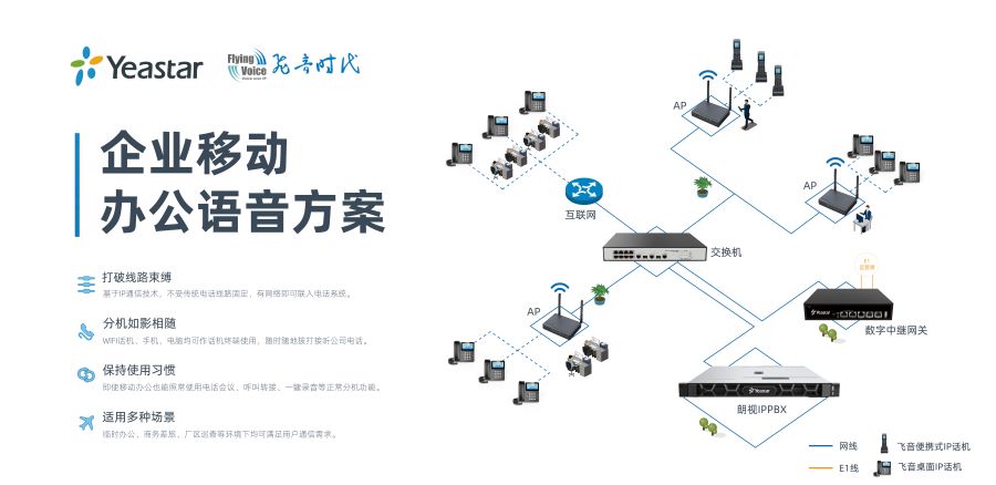 企业移动办公语音方案,让办公不再受限于地点,在无线网络覆盖的今天,随时随地都可接入电话通讯系统,轻松使用电话会议、呼叫转接、一键录音等丰富语音功能。