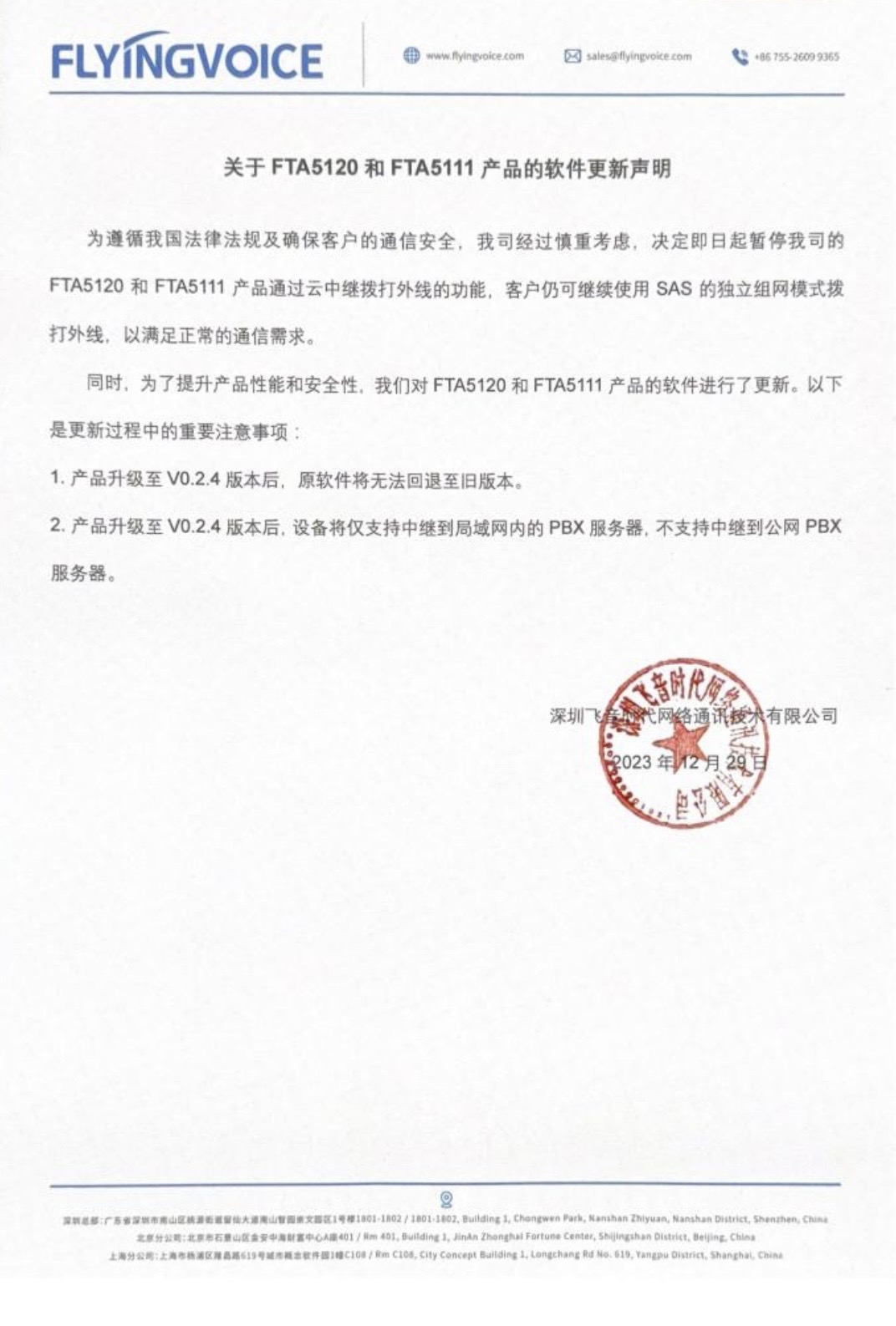 为遵循我国法律法规及确保客户的通信安全,我司经过慎重考虑,决定即日起暂停我司的 FTA5120FTA5111产品通过云中继拨打外线的功能,客户仍可继续使用SAS的独立组网模式拨打外线 以满足正常的通信需求。