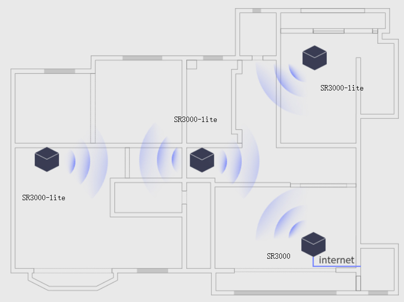 Mesh组网:由Controller(主路由)搭配Agent(从路由)组网,可通过有线、无线、混联的方式进行组网,且在组网成功后,形成一个统一的网络。Controller负责管理整个网络,所有Agent都直接或间接与它相连,且各Agent互相连通并提供无线接口。ITB8888通博SR3000一般作为Controller,SR3000-lite作为Agent(SR3000也可作为Agent)。