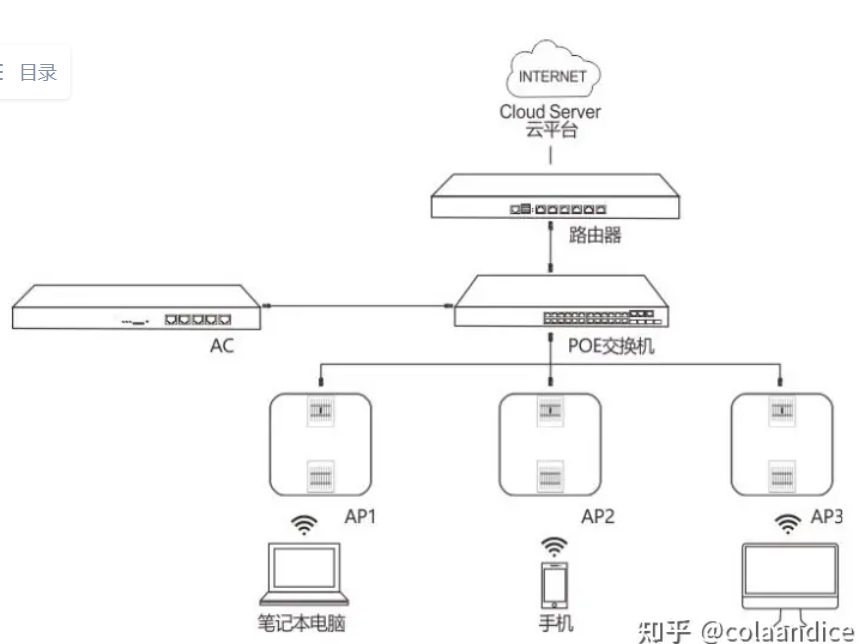 AP+AC组网:由AC(无线控制器)作为网络核心,集中控制所有AP(无线接入点),并将它们汇聚接入Internet。AP则类似于信号放大器,向上有线接入Internet,向下发出Wi-Fi信号供无线终端接入。用户需提前做好网络布线规划,根据区域部署AP覆盖无线网络,但各AP之间不相互连接,只能通过AC来确定各个AP的状况。