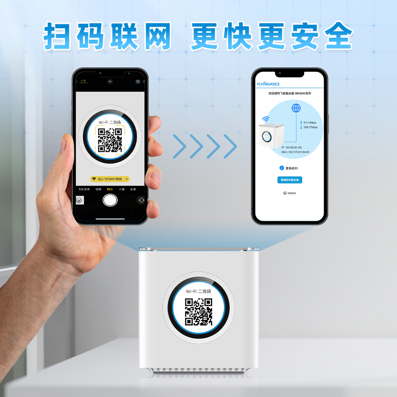 同时,考虑到手机使用的便捷性与高效性,这款 SR3000 还支持二维码扫码联网。我们无需知晓 WiFi 的 SSID 和密码,通过扫码即可自动连接。这既避免了主人不想让客人知道 WiFi 密码的尴尬,又帮助用户解决了因复杂密码难记、易输错而导致无法连接 WiFi 的问题。更为惊喜的是,向导配置、一些重要配置以及网络信息都可以通过手机扫码进行查看和操作,例如 IP 信息、MAC 信息、网络连接模式设置、WiFi 设置、LCD 熄屏设置、测速、重启等。这简直是小白用户和“懒人”的福音!