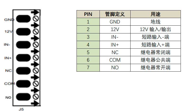 短路输出接口有NC、COM、NO三个接口,可用于连接门禁、告警灯、报警器等输出设备,默认情况下是NC/COM连通,额定电压为12V,最大电压为DC30V/1A、AC125V/0.3A。