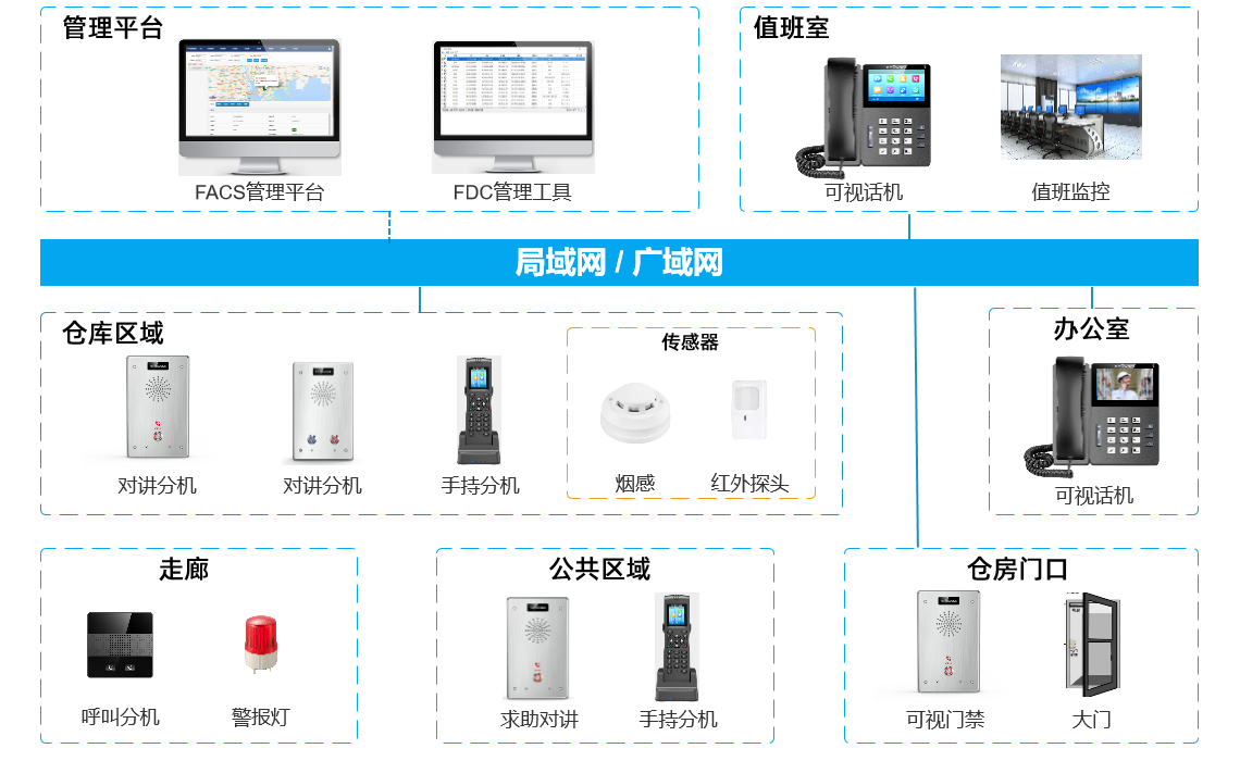 3. 仓库内设备多台i86Box对讲,接入烟感、湿度、温度等传感器,当周围环境超过要求,自动触发报警和呼叫值班中心