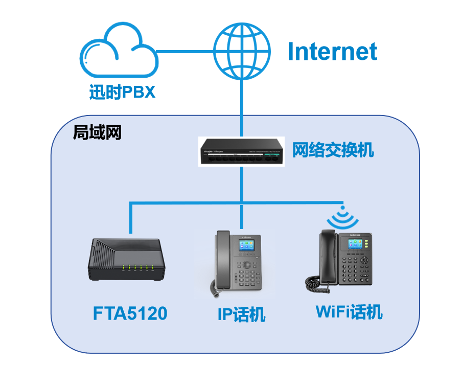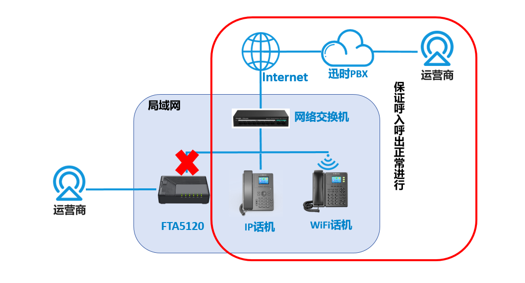 用户在使用VoIP语音通讯方案的时候,可能会遇到各种不可抗力因素导致迅时PBX不通或是连接中断的情况,这时候我们的SAS功能就可以起作用然后保证通讯的正常进行,同样,当FTA5120出现异常时,我们也可以通过迅时PBX进行通讯,这样就可以保证我们的通讯更加可靠稳定。