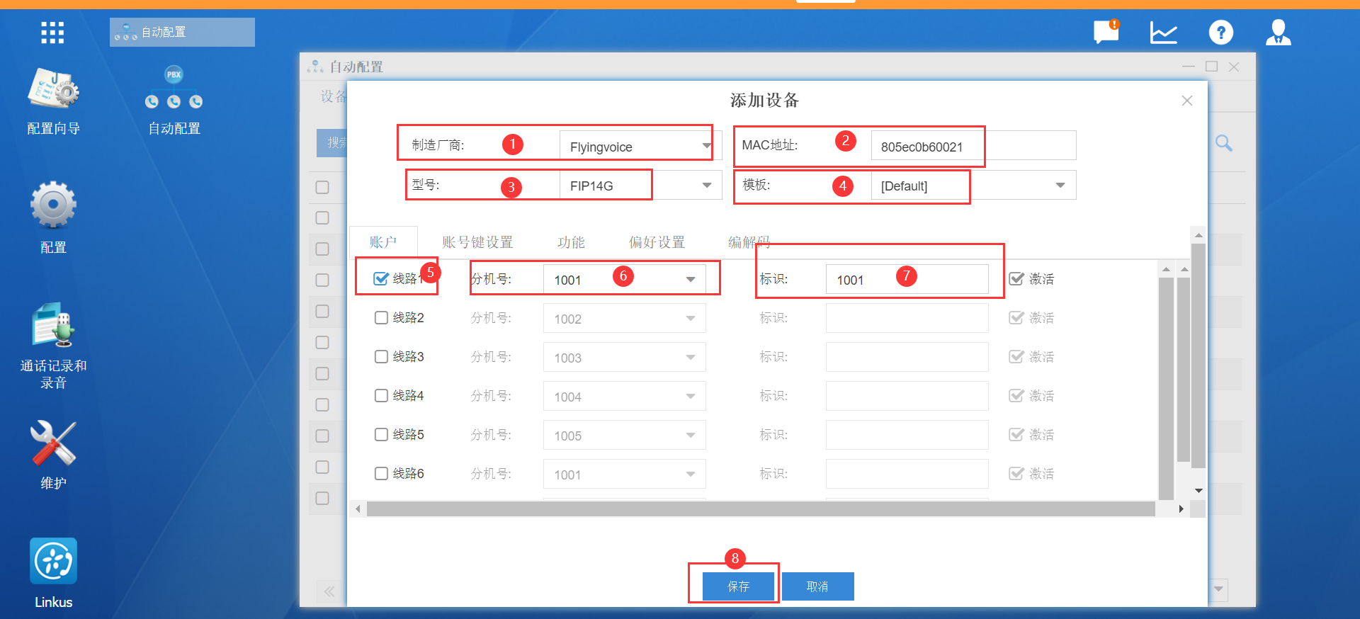 3.选择话机的制造厂商-》手动输入话机MAC地址-》选择话机的型号-》选择配置模板 -》启用线路 -》选择分机号 -》填写分机标识 -》保存;