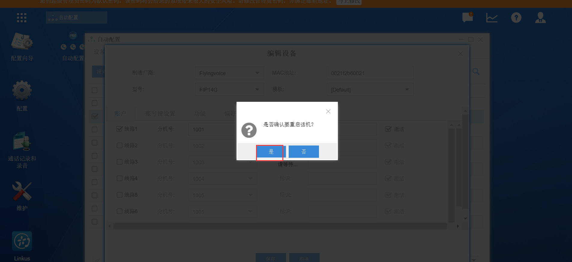 3.保存之后会出现重启话机的提示,点击“是”重启话机,自动部署即可完成。